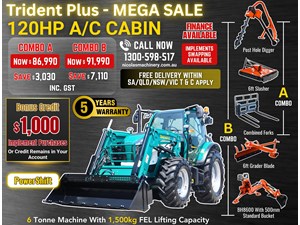 2025 TRIDENT PLUS 120HP POWERSHIFT 4WD A/C CABIN TRACTOR WITH 4IN1 BUCKET COMBO DEAL 5 YEARS LABOUR AND PARTS WARRANTY AUSTRALIA WIDE DELIVERY & SUPPORT$86,990Goulburn, NSWContact DealerDetails