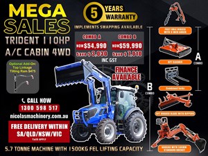 TRIDENT 110HP 4WD A/C CABIN TRACTOR WITH 4IN1 BUCKET (5,650KG GROSS WEIGHT &1,500KG FRONT LOADER LIFTING CAPACITY) 5 YEARS LABOUR AND PARTS WARRANTY AUSTRALIA WIDE DELIVERY & SUPPORT$52,990Goulburn, NSWContact DealerDetails